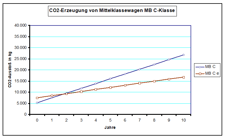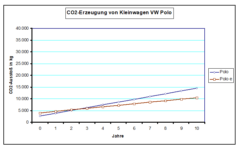 5. Ergebnisse Die folgenden Diagramme zeigen, wieviel Kilogramm CO2 die jeweiligen Fahrzeugtypen als V-PKW und als E-PKW über längere Zeiträume ausstoßen. Es werden keine Kosten betrachtet!